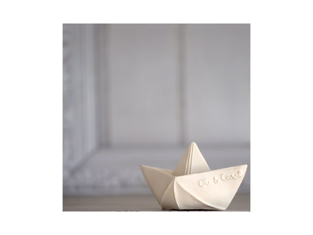 Senzorická eko-hračka, vyrobená z kaučuku, v tvare pastelovej nude origami loďky, vhodná ako hračka do vody či na žuvanie a posilnenie ďasien. V štýlovej telovej nude farbe.